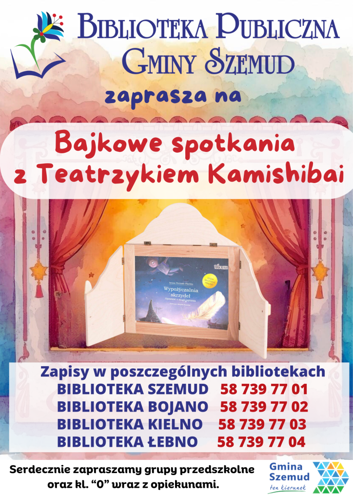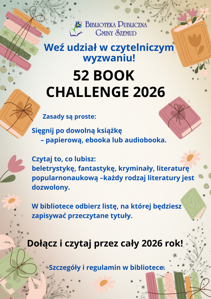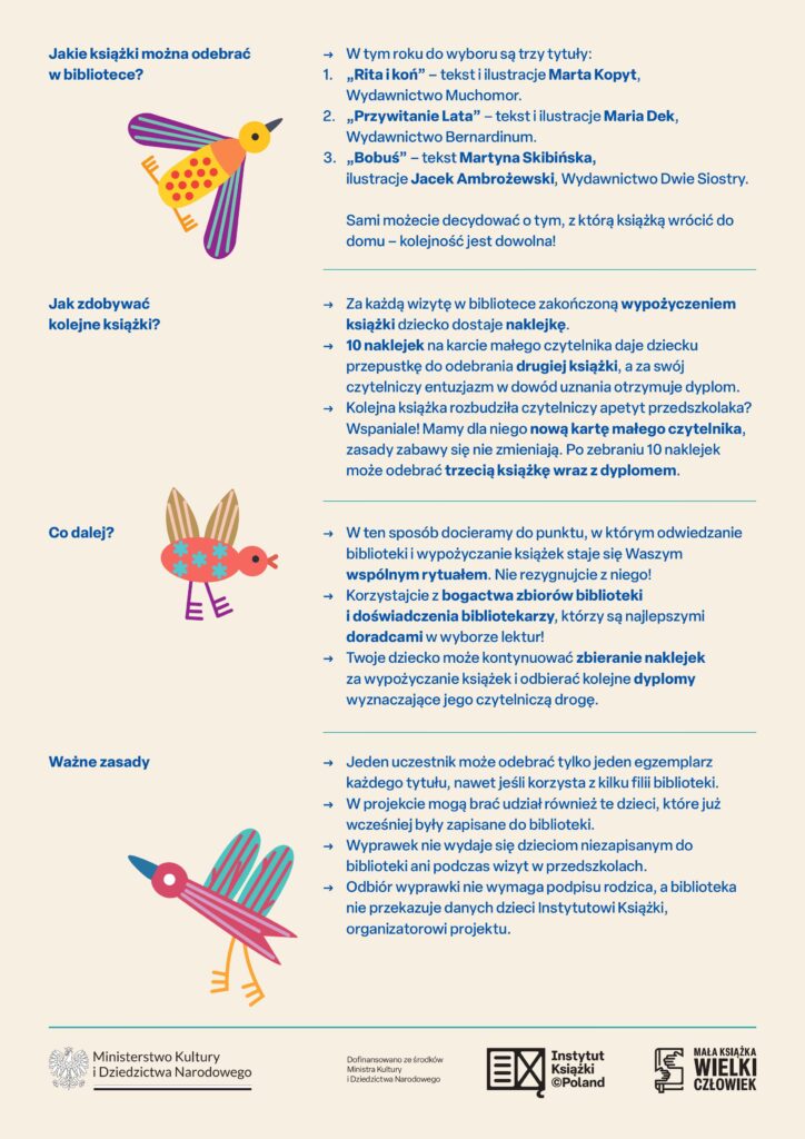 Biblioteki Publiczne Gminy Szemud przystąpiły do projektu „Mała książka – wielkiczłowiek”, do którego zapraszamy dzieci z roczników 2019-2022. Uczestnik otrzyma wyprawkę – książkę i Kartę Małego Czytelnika. Za każdą wizytę i wypożyczenie przynajmniej jednej książki, dziecko dostanie naklejkę, którą umieści na swojej karcie. Za zebranie 10 naklejek mały uczestnik otrzyma pamiątkowy dyplom.