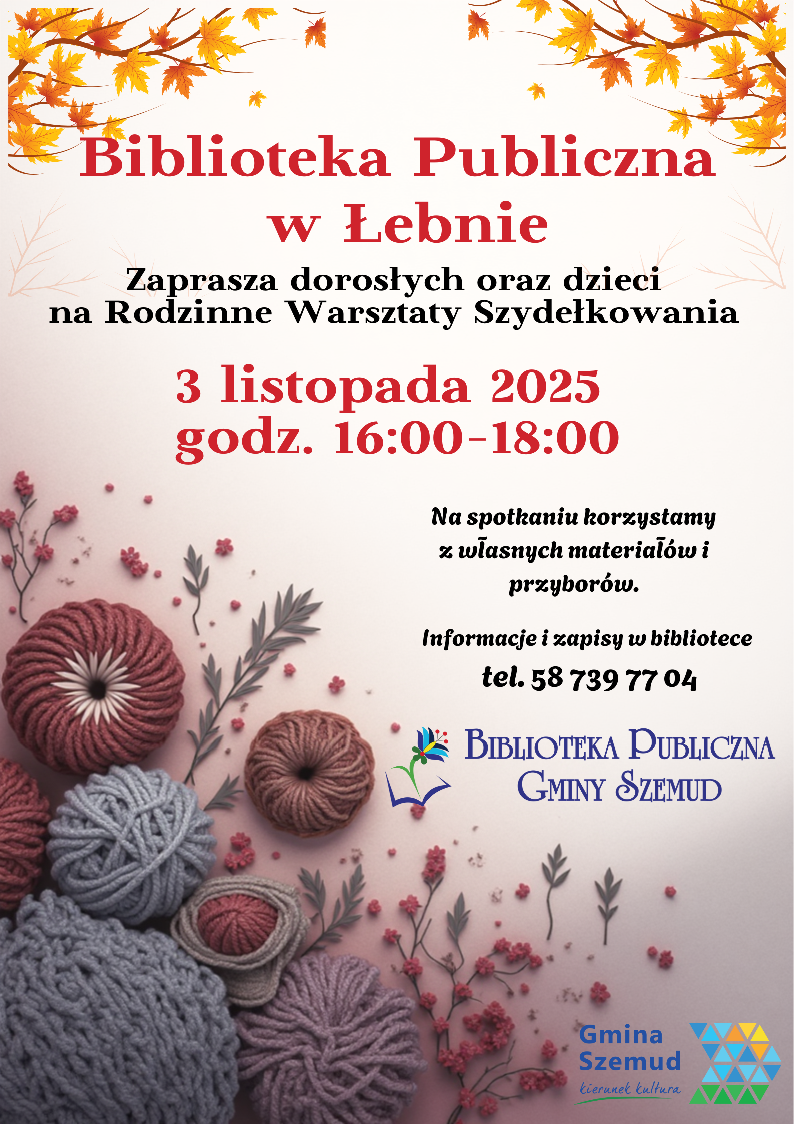 20 października @ 16:00 - 18:00 Spotkanie Szydełkowe w Bibliotece Publicznej w Łebnie Biblioteka w Łebnie ul. Kartuska 9, Łebno