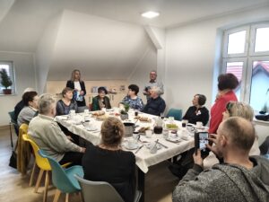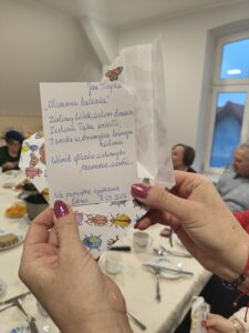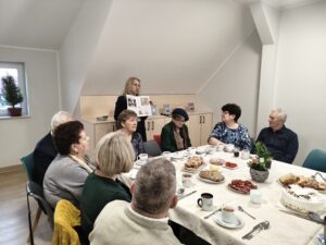 Następnie zaproszeni goście udali się do biblioteki, gdzie mieści się Izba Pamięci Patrona. W serdecznej, pełnej wspomnień atmosferze przywoływano twórczość poety, jego wrażliwość na piękno rodzinnej ziemi oraz troskę o zachowanie kaszubskiej tradycji i języka. Wspominano również jego działalność społeczną i literacką, dzięki której kultura regionu zyskała silny i rozpoznawalny głos. Bardzo miłym akcentem była niespodzianka przygotowana dla każdego z gości przez panią dr Joannę Herman w postaci fragmentów poezji i prozy pisarza.